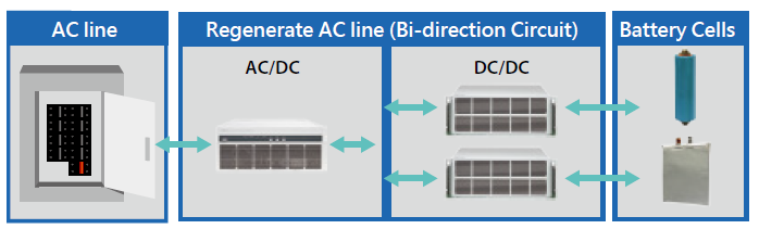 专门为锂离子电池的化成/分容所设计的充放电系统,载盘式生产,依据制程分为纯充电系统与充放电系统。系统以PC控制运行,主体由仪器柜与电池库位柜组成,仪器柜内电路设备,设备具有高精度、高可靠性与节能的特点,柜体有热流设计避免积热保障稳定性;电池库位柜由压合机构与电极夹具组成,放入载盘后自动接触电池的电极进行测试,专业的库位设计有效提高生产稳定性,电池库位柜体依据温控方式与制程特性分为环境温控的开架式与温控柜体式,各库位独立作动运行,库位间具防火设计避免异常时延烧。