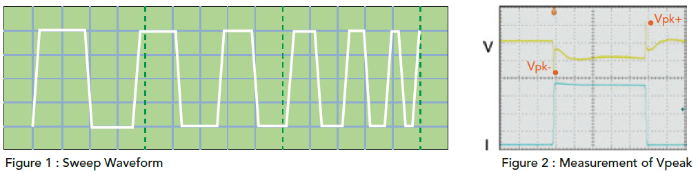 63600亦提供了一个独特的动态频率扫瞄模式(如Figure 1所示),可线性改变其拉载频率,拉载频率最高可达50kHz,此模式可测出待测物在最坏情况下的最大/最小电压峰值。此动态频率扫瞄功能的采样率为500kHz,Figure 2为最大/最小电压峰值的范例。动态负载模式可仿真各种不同负载的情况,符合大部分使用者的需求。而63600的远程负载传感器及控制线路,可确保动态负载操作下的波形失真率最小化。