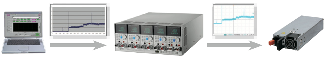 然而63600系列提供了另一个更方便的选择-使用者自定义波形,能模拟真实的拉载电流,可将经示波器撷取的实际电流波形数据或自行编辑的电流波形,透过图形化操作软件轻易的将波形储存在63600各模块的内部随机存取内存(RAM),即可拉载使用者所定义的任意波形,可省下DAQ卡或 波形产生器的费用,如下图所示。63600系列的每个模块提供10组储存空间可存波形,最高可高达120万个波形点数,足以提供所需的测试。