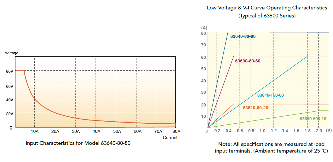 63600的模块皆有三段负载操作范围设定,于每个操作范围的满载下,最小的操作电压为0.5V。63640-80-80的最小操作电压甚至可达 0.4V,可拉载的最大额定电流则需依据各操作范围的电流大小而定。此低电压操作的设计,适合用来测试D/D转换器、燃料电池及其他低电压-高电流的组件。另外,若欲操作在0V至0.5V间,可拉载的电流大小,请参考下图的V-I曲线。
