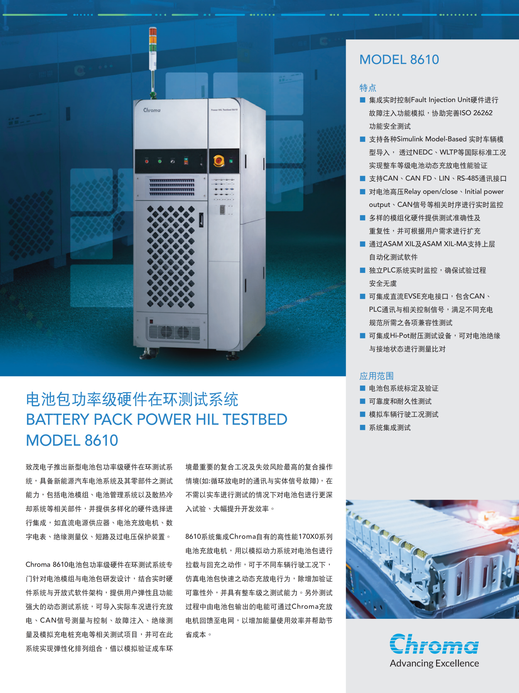 Chroma 8610电池包功率级硬件在环测试系统专门针对电池模组与电池包研发设计,结合实时硬件系统与开放式软件架构,提供用户弹性且功能强大的动态测试系统。
