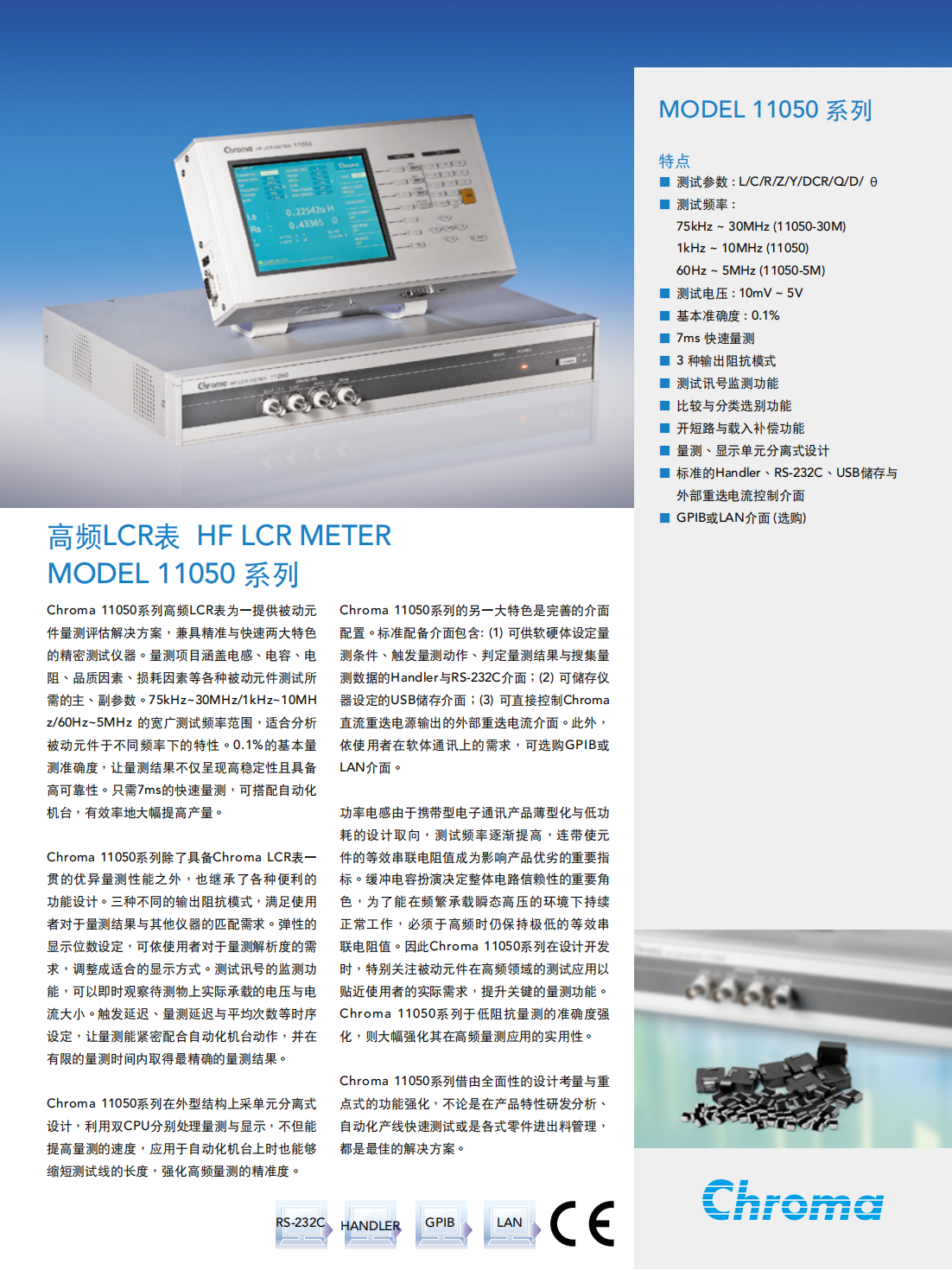 Chroma 11050系列高频LCR表为一提供被动元件量测评估解决方案,兼具精准与快速两大特色的精密测试仪器。量测项目涵盖电感、电容、电阻、品质因素、损耗因素等各种被动元件测试所需的主、副参数。
