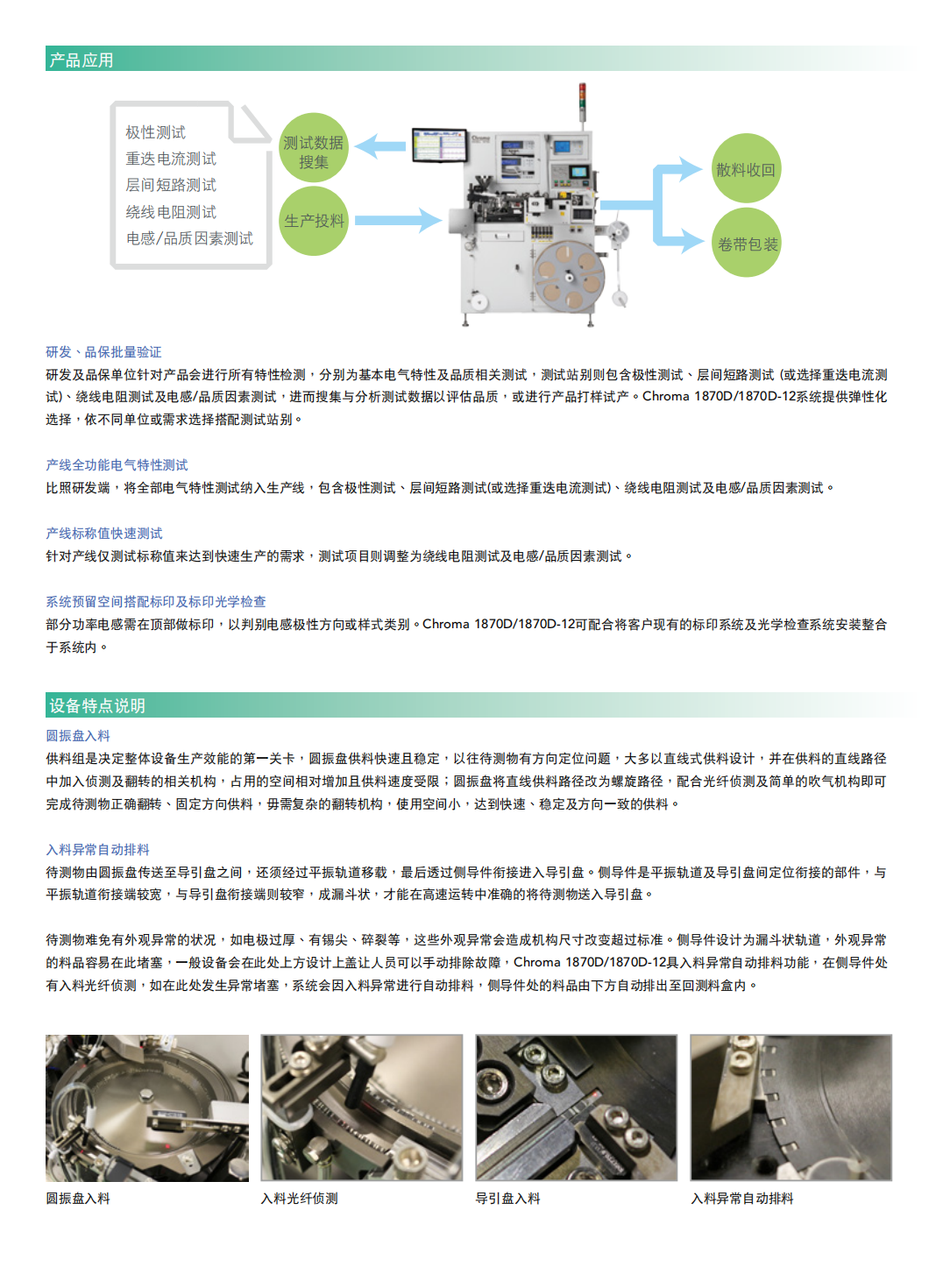 Chroma 1870D系列(1870D/1870D-12)是一款为晶片型电感所设计的自动化测试生产设备,包含晶片电感所需的各项测试功能,并具备制程终端的卷带包装自动化机械,达到生产线的制造自动化。