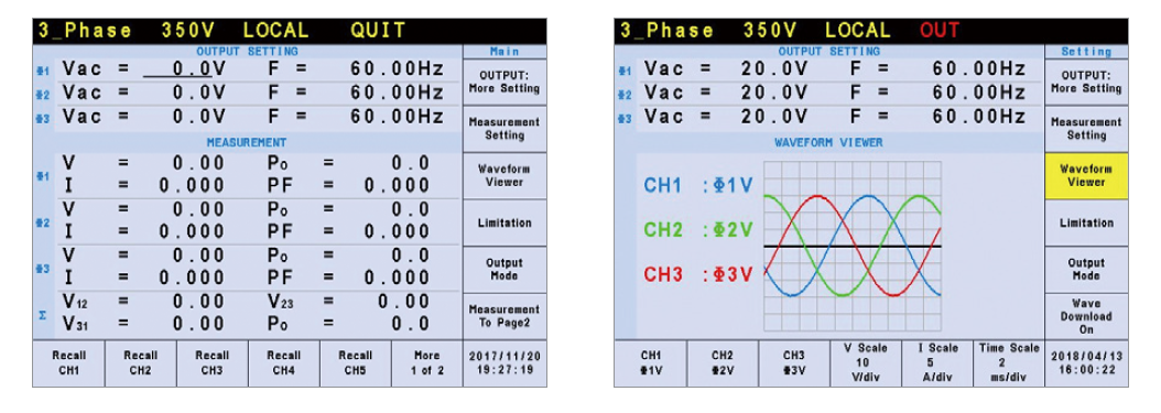 Chroma 61607/61608/61609及61611/61612机种提供选择单相或三相输出功能,使用者可以经由前面板或远端控制选择单相或三相输出模式。即使设置在单相输出模式,仍然可以提供功率输出的能力,不需担心输出功率规格会有递减的情形。