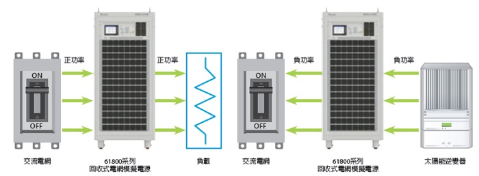 Chroma 61845回收式电网模拟电源是一款定电压输出的可编程交流电源,可应用于一般用电产品(例如: 家电产品,开关式电源)的测试,测试时Chroma 61845回收式电网模拟电源会对负载输出功率,通过拉载过电流设定(OCP)功能来保护Chroma 61845。当待测物为能将能量回馈到电网的产品(例如:太阳能逆变器,双向充放电机)等分散式发电设备时,Chroma 61845在输出电压的同时,若侦测到输出得功率为”负(-)”功率时,Chroma 61845就会启动能源回收机制,将逆变器所产生的逆灌电流/负功率能量转换到交流电网。通常的交流电源无法承受待测物回灌的能量。Chroma 61845可应用到正负电压/电流正反方向的象限,且具备能源回收功能,正足以成为电网模拟电源。
