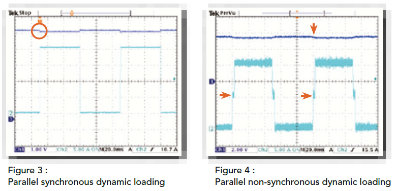 除具备动态拉载功能外,针对大功率的服务器电源,更可进行各个模块的并联同步动态拉载,以满足大功率的拉载应用,一个机框内的模块功率总和最多可达2,000W的动态同步拉载。Figure 3为模块并联时同步动态波形,Figure 4为模块并联时不同 步动态波形。在同步动态拉载情况下,所测得的电压峰值(Vpeak)才是正确的数值。而不同步动态拉载的情况,所测得的电压峰值将是错误的数值。