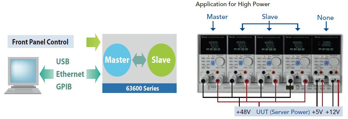 63600具有智能型主/从控制模式,当负载功率需求增加时,可透过并联的方式(主/从控制)来达到所需的电流及功率。当设定成主/从控制模式时,所有设定成主/从控制的模块形同一个单一负载,用户仅需在主模块上编程负载电流,主模块经过计算后会自动将电流分配至其他模块,如此可大大简化使用者的操作步骤。63600同时备有USB标准界面、GPIB选配接口及Ethernet选配接口,用户可透过这些接口进行远程控制及其他的自动测试应用。