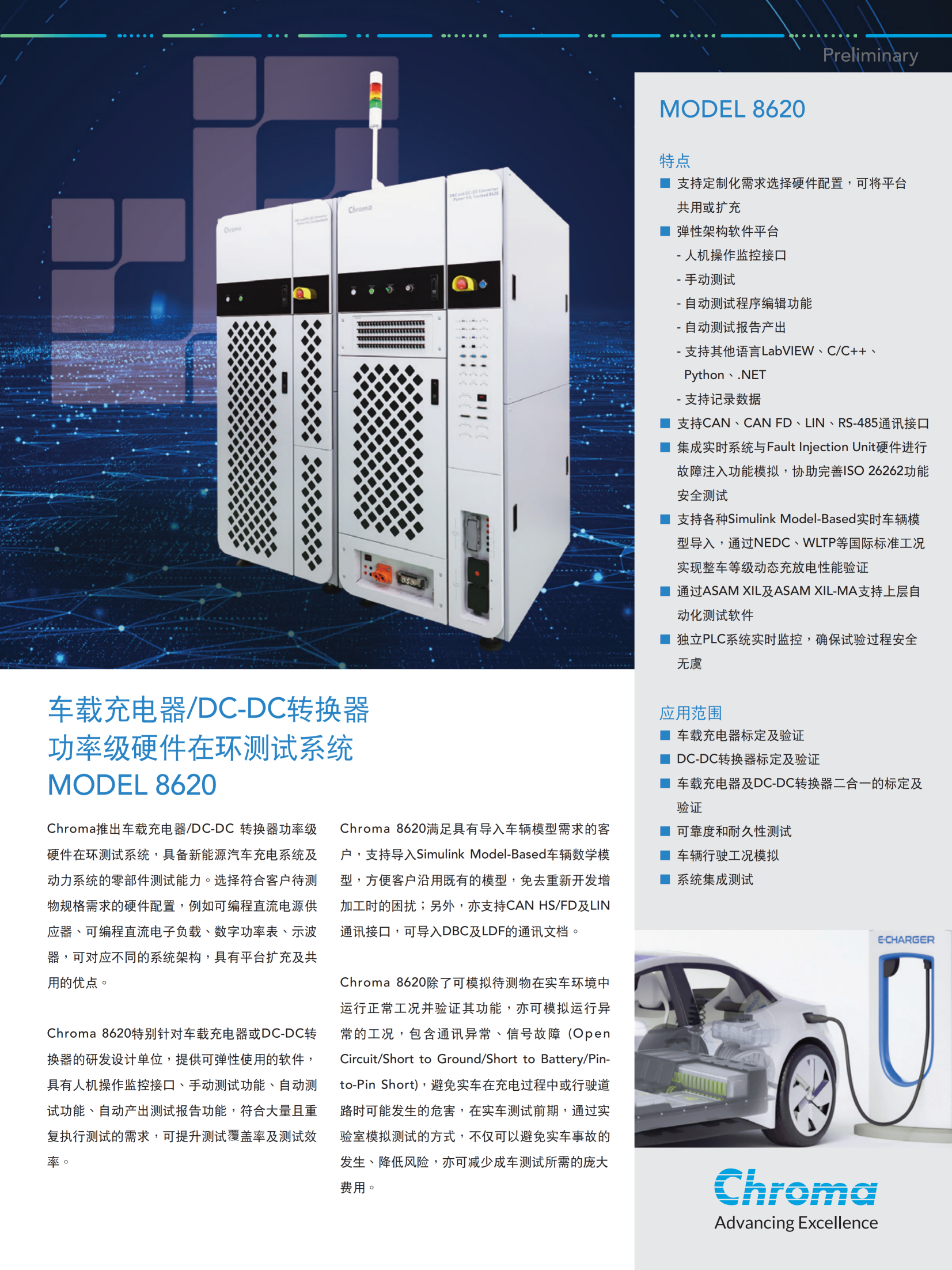Chroma推出车载充电器/DC-DC转换器功率级硬件在环测试系统,具备新能源汽车充电系统及动力系统的零部件测试能力。