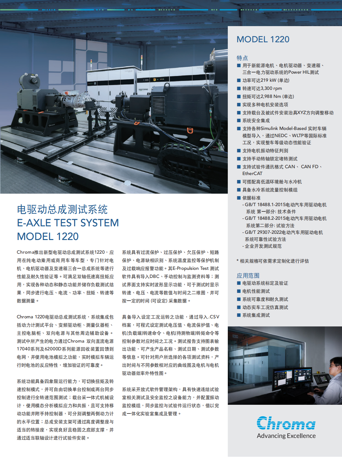 Chroma推出新型电驱动总成测试系统1220,应用在纯电动乘用或商用车等车型,专门针对电机、电机驱动器及变速箱三合一总成系统等进行性能及耐久性验证等。