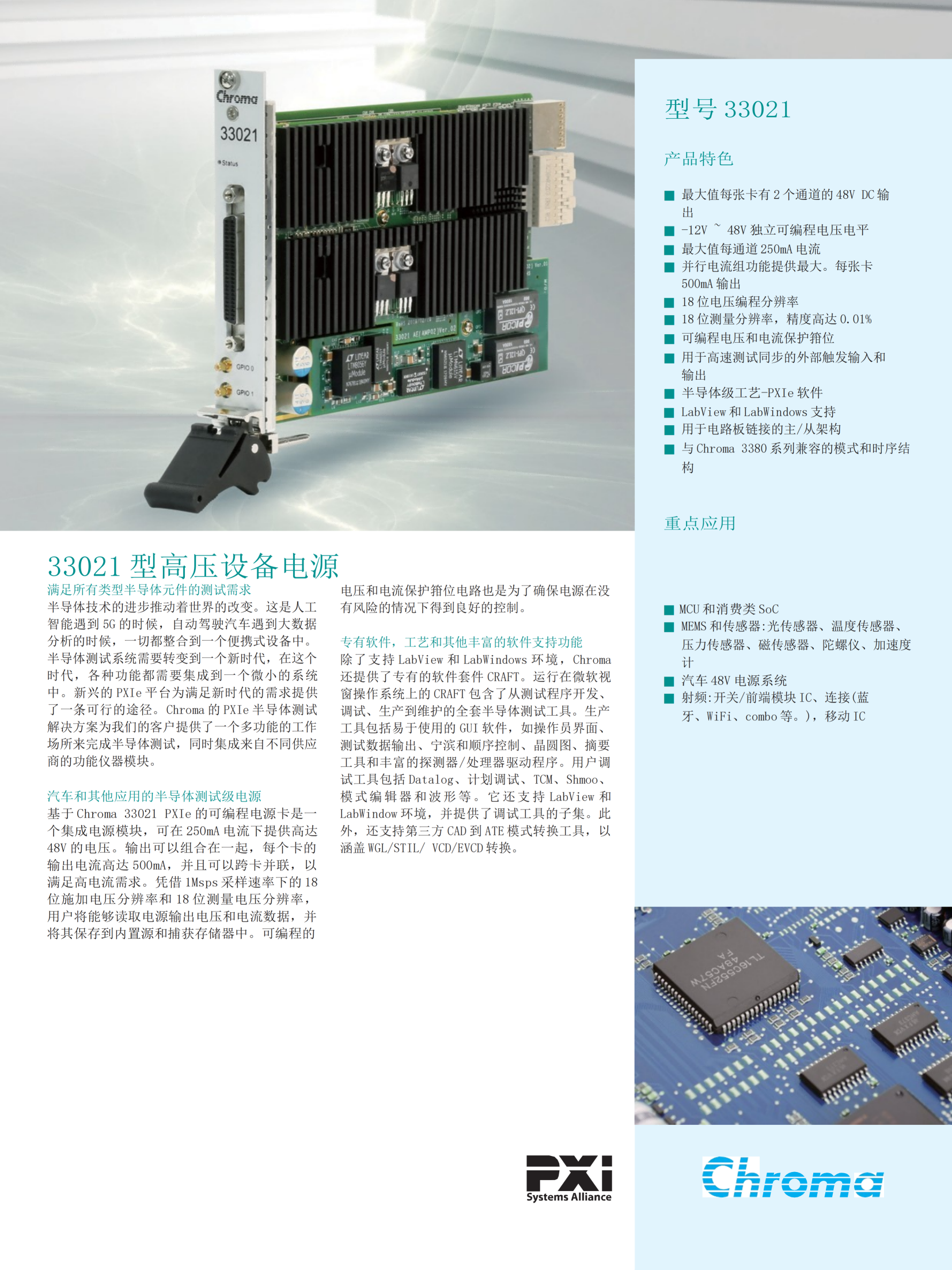 基于 Chroma 33021 PXIe 的可编程电源卡是一个集成电源模块,可在 250mA 电流下提供高达48V 的电压。输出可以组合在一起,每个卡的输出电流高达 500mA,并且可以跨卡并联,以 满足高电流需求。